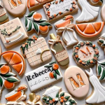 A dozen custom cookies with 4–7 designs. Includes custom details such as florals, metallics, and lettering.
